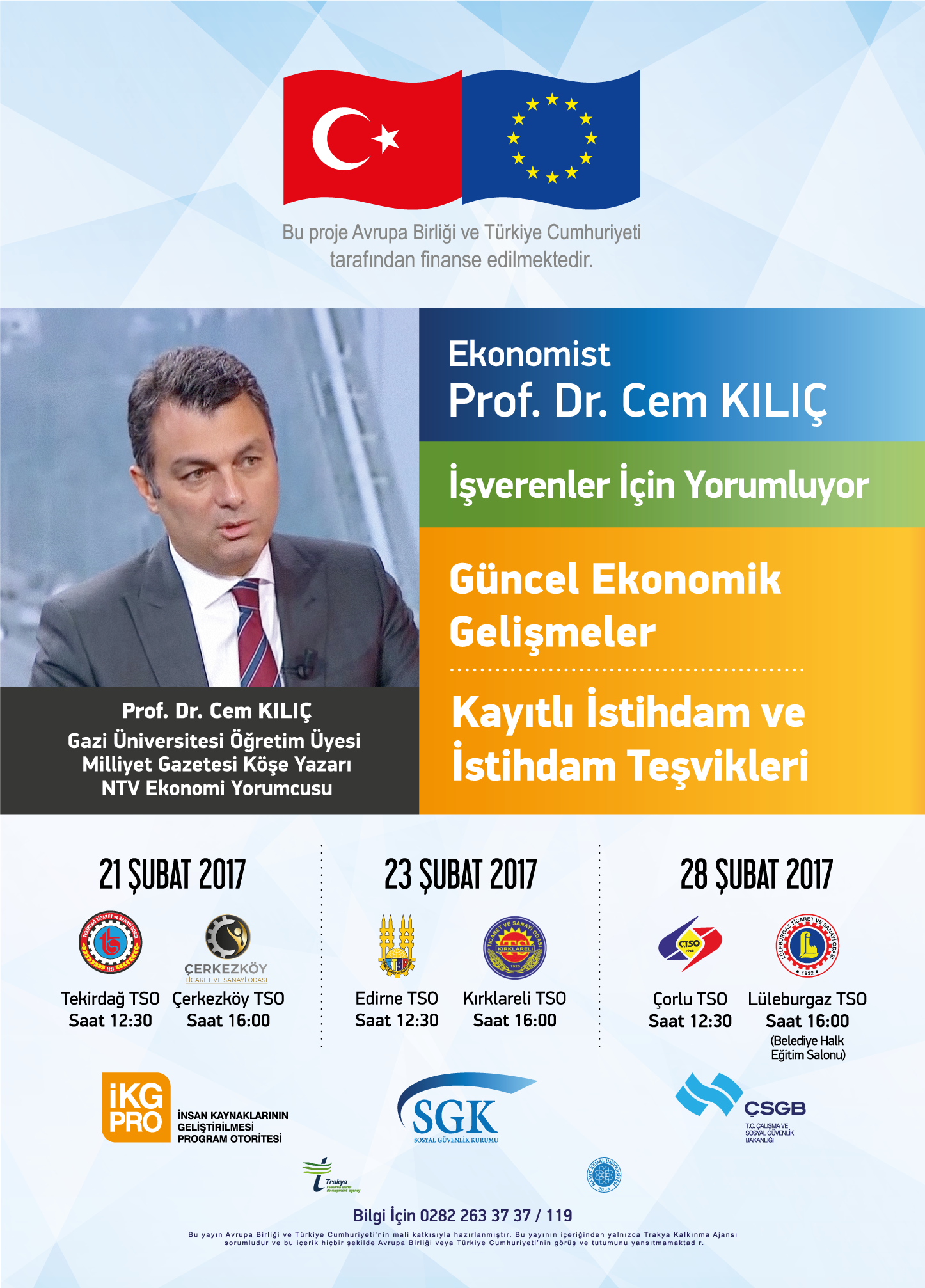 Trakya Kalkınma Ajansı tarafından yürütülen “Kayıtlı Çalışıyorum” projesi kapsamında Prof. Dr. Cem Kılıç’ın konuşmacı olarak katılımıyla işverenlere yönelik olarak aşağıda belirtilen program çerçevesinde konferanslar gerçekleştirilecektir.